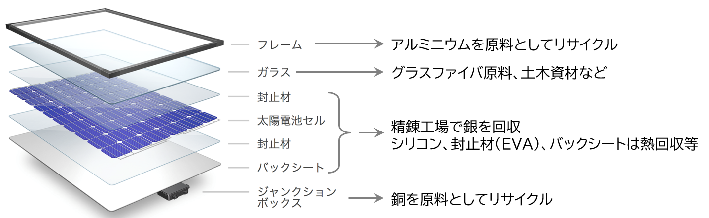 そのシリコン系の太陽光パネルは、図のようにフレーム、カバーガラス、封止材、太陽電池セル、バックシート、ジャンクションボックスで構成されています。リサイクルの際は、それぞれ構成素材毎に処理がおこなわれます。