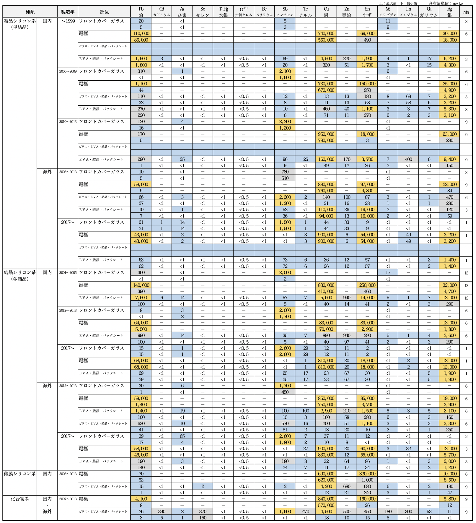 環境省は「太陽光発電設備のリサイクル等の推進に向けたガイドライン(第二版)」の中で、太陽電池モジュールの各部位の含有量試験および溶出試験の結果を公表しています。