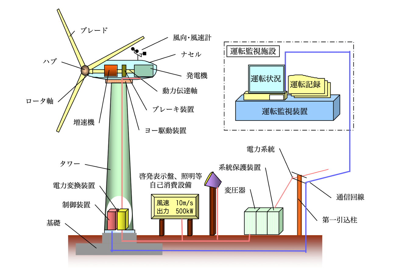 風力発電は、風の運動エネルギーを風車(風力タービン)によって回転エネルギーに変え、その回転を直接、または増速機を経た後に発電機に伝送し、電気エネルギーに変換する発電システムです。 風が持つ運動エネルギーは風を受ける面積に比例し、風速の3乗に比例して増大する性質を持っており、より風の強い場所に設置すること、大きい翼で効率良く風を受けることが重要となります。